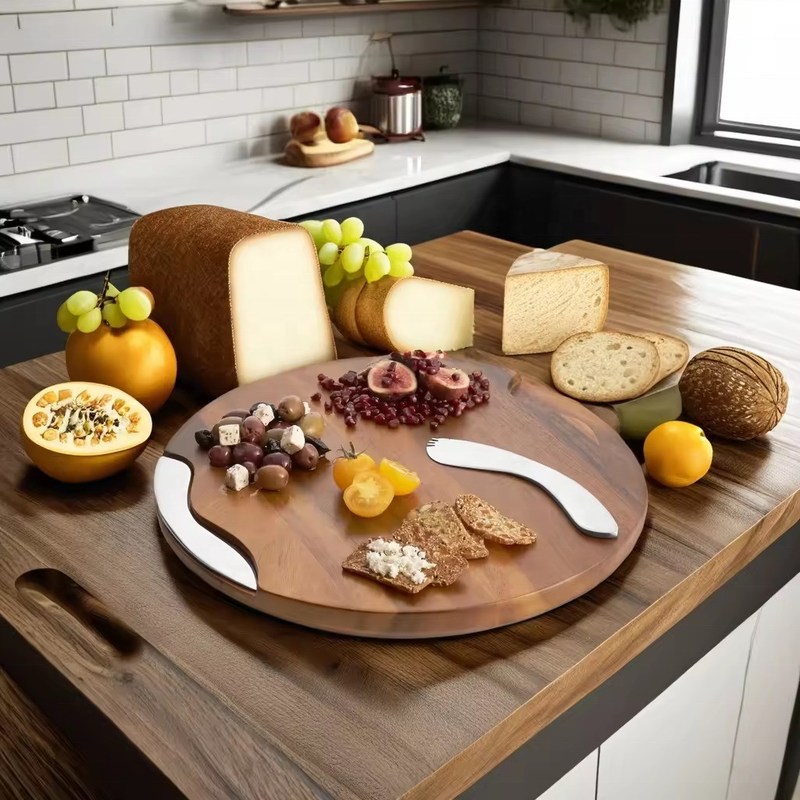 Logotipo personalizado Acceptável Tabela de corte de acácia de ranhuras redondas com faca e espalhadora